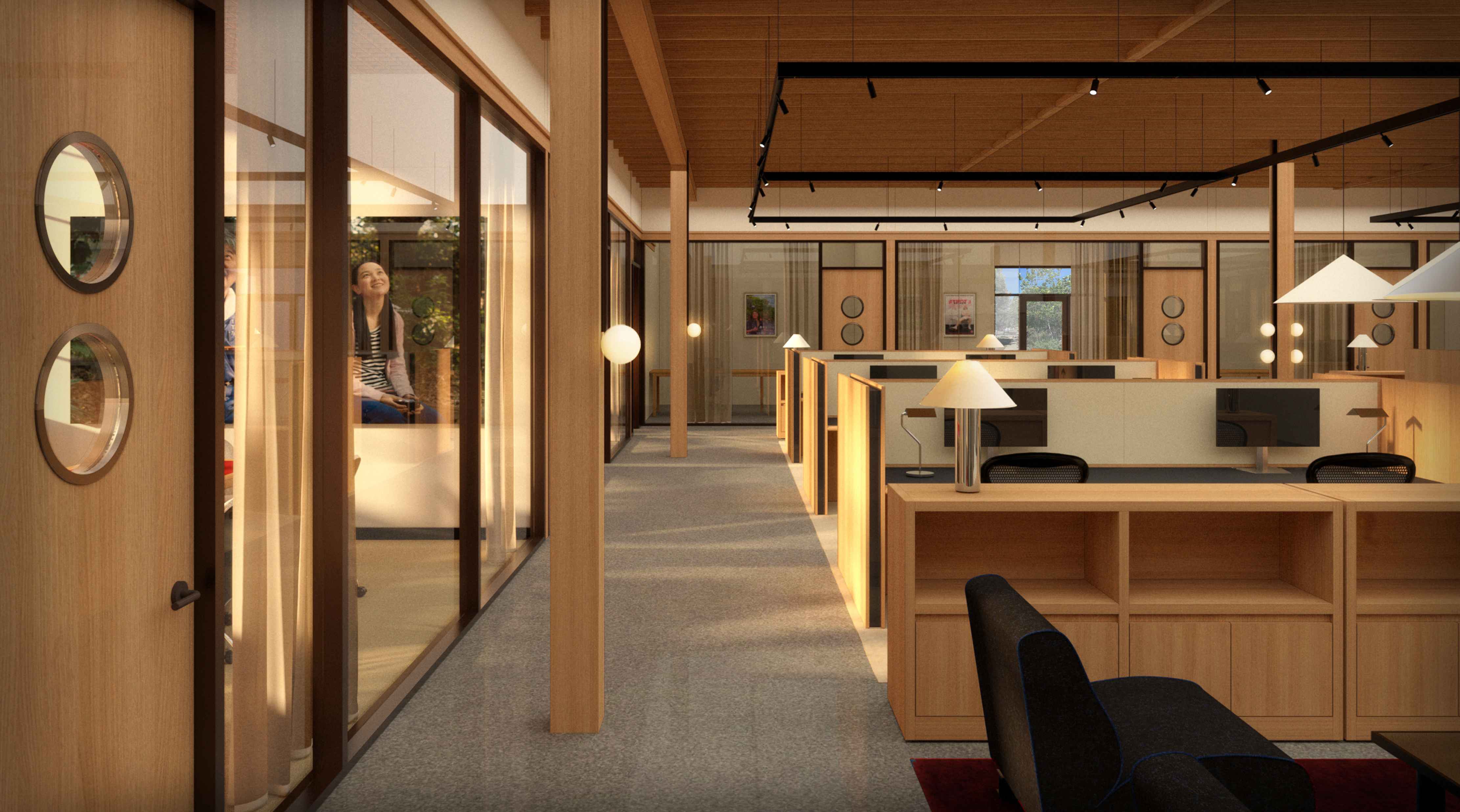 The workspaces carry that same warmth into a different register. Track lighting and pendant fixtures layer over exposed timber structure, keeping the environment feeling human and focused rather than corporate. The goal was a space where creative people actually want to spend time — where the lighting supports deep work without feeling clinical, and where the connection to natural light through the glazed partitions stays alive throughout the day.