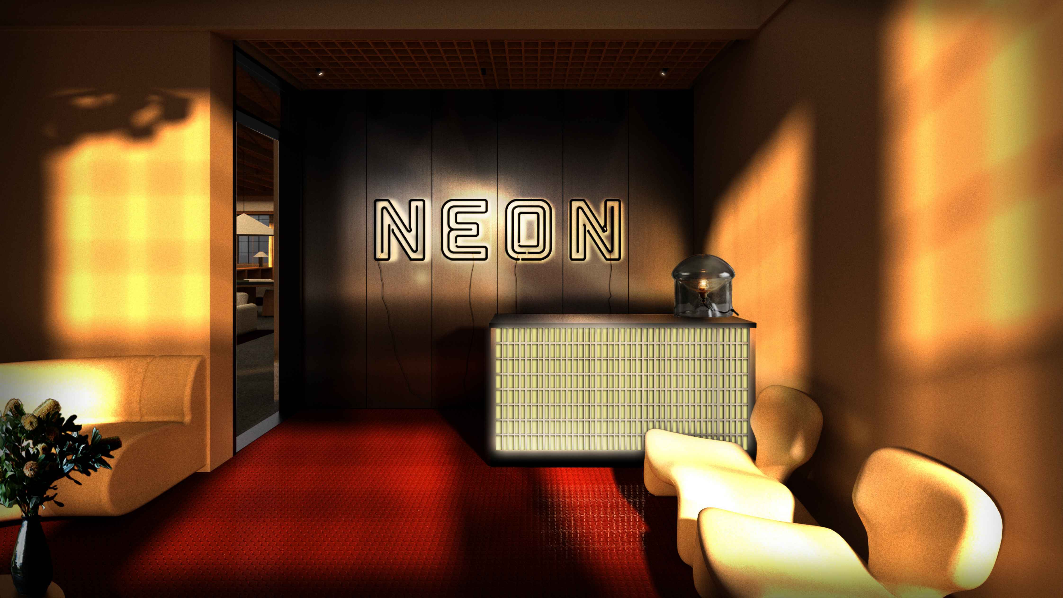 The lobby sets the tone from the moment you walk in. Warm amber light washes across rich wood paneling while the Neon Rated signage glows against the dark backdrop — confident, cinematic, immediately on-brand. It doesn't try to impress you. It just does. That's exactly the kind of restraint that takes real intention to pull off.